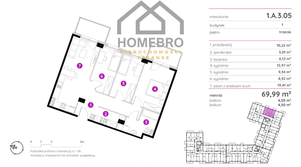 Oferowana 4-pokojowa nieruchomość o powierzchni 69,99 m² z dwoma balkonami jest usytuowana na 3 piętrze.