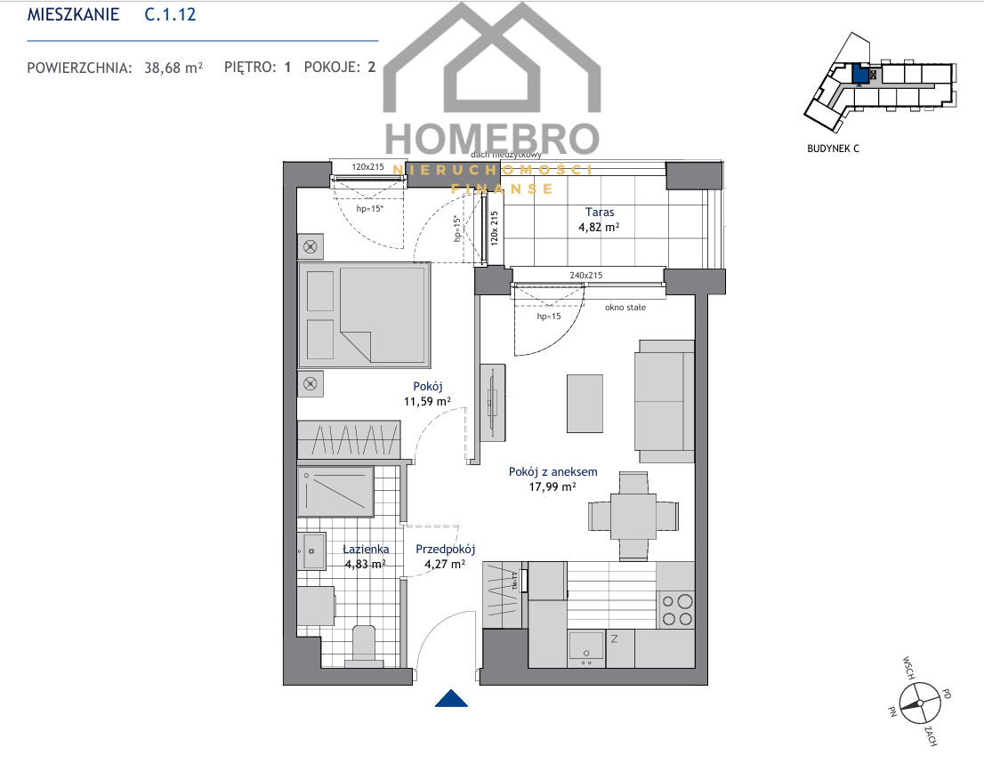 Mieszkanie 2 pokojowe o powierzchni 38,41 m2, z ekspozycją wschodnią, usytuowane na pierwszym piętrze. Pokój dzienny z aneksem (19,45 m2) z wyjściem na balkon (5,03 m2). W mieszkaniu znajduje się sypialnia (10,82 m2) oraz łazienka (4,10 m2). Całość dopełnia przedpokój (4,04 m2) z miejscem na szafę w zabudowie.