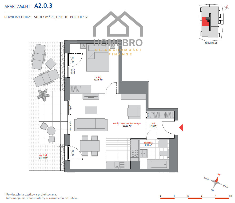 Apartament 2 pokojowy o powierzchni 50,07 m2, z ekspozycją zachodnią, usytuowany na parterze. Salon z aneksem kuchennym (28,60 m2) posiada wyjście przez przesuwne drzwi balkonowe na ogródek o powierzchni 24,40 m2. W apartamencie znajduje się sypialnia (12,76 m2) oraz łazienka (4,59 m2).