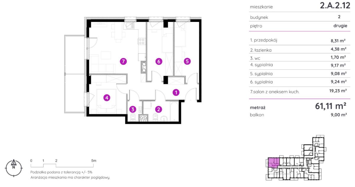 Oferowana 4-pokojowa nieruchomość o powierzchni 61,11 m² z przestronnym balkonem (9 m²) jest usytuowana na 2 piętrze.