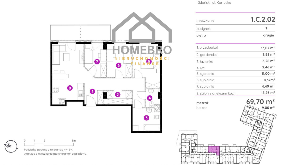Oferowana 4-pokojowa nieruchomość o powierzchni 69,70 m² z przestronnym balkonem jest usytuowana na 2 piętrze.