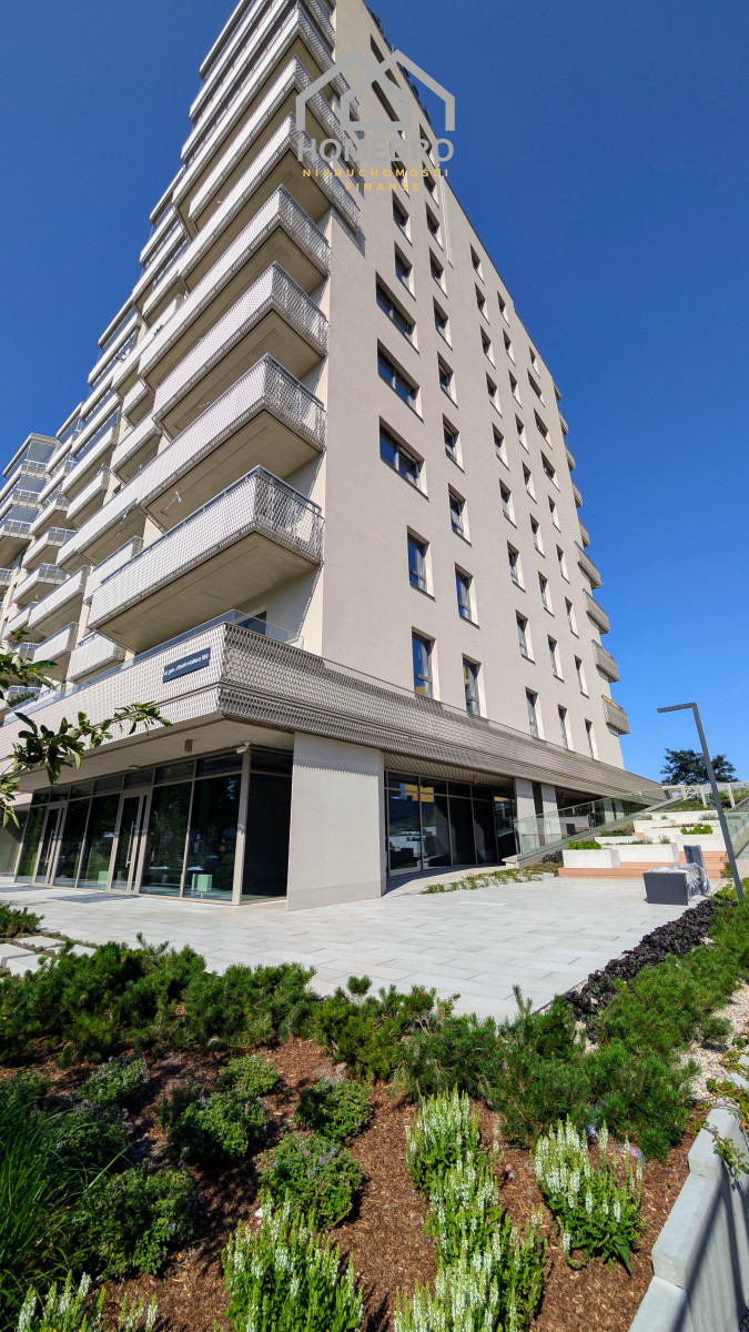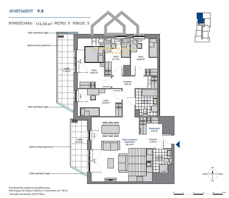 Apartament 5-pokojowy o powierzchni 112,54 m², usytuowany na dziewiątym piętrze, z ekspozycją północno-zachodnią, która zapewnia wnętrzom delikatne, równomierne światło. Przestronny salon z aneksem kuchennym (38,25 m²) otwiera się na loggię (8,16 m²), tworząc przyjemną strefę do wypoczynku.